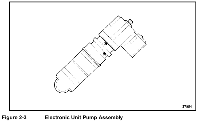 The Series 2000 Electronic Unit Pump (EUP) provides fuel to the fuel injector nozzle. The nozzle directs pressurized fuel directly into the combustion chamber. The EUP uses a solenoid operated valve to control injection timing and metering. The source for high pressure fuel delivery is the cam/rocker arm system. Fuel injection begins when the solenoid valve is closed. Opening the solenoid valve ends injection. The duration of valve closure determines the quantity of fuel injected. See Figure 2-3.