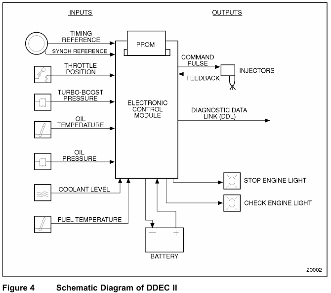DDEC II also controls the timing and amount of fuel injected into each cylinder. The system also monitors several engine sensors that send electrical signals to the main ECM. See Figure 4. Unlike DDEC I, the DDEC II ECM uses this information to actuate the EUI solenoids. DDEC II incorporates all of the control electronics into one engine mounted ECM instead of the ECM and EDU that are required in DDEC I. The ECM also has the ability to limit or shut down the engine completely (depending on option selection) in the case of damaging engine conditions, such as low oil pressure, low coolant level, or high oil temperature.