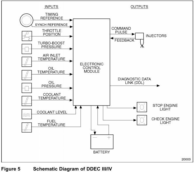 The DDEC III/IV ECM receives electronic inputs from sensors on the engine and vehicle, and uses the information to control engine operation. It computes fuel timing and fuel quantity based upon predetermined calibration tables in its memory. Fuel is delivered to the cylinders by the EUIs, which are cam-driven to provide the mechanical input for pressurization of the fuel. The ECM controls solenoid operated valves in the EUIs to provide precise fuel delivery. See Figure 5.