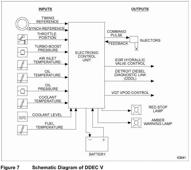 The DDEC V ECU receives electronic inputs from sensors on the engine and vehicle, and uses the information to control engine operation. It computes fuel timing and fuel quantity based upon predetermined calibration tables in its memory. DDEC V provides an indication of engine and vehicle malfunctions. The ECU continually monitors the DDEC V system. See Figure 7.