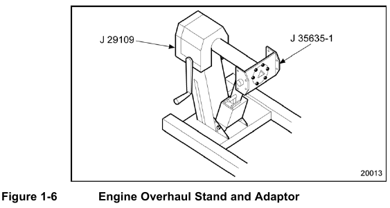 19.Use engine overhaul stand (J–29109) with stand adaptor plate (J–35635–1, part of tool set J–35635–A) for support when stripping a Series 60 engine cylinder block. See Figure 1-6.