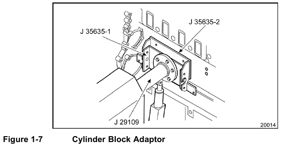 20. Bolt cylinder block adaptor (J–35635–2, part of tool set J–35635–A) to the cylinder block and mate it with the stand adaptor (J–35635–1, part of tool set J–35635–A). See Figure 1-7.