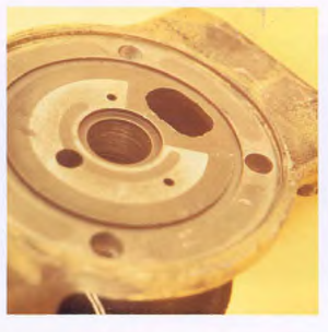 Determine the cause of restriction of oil to the bushing. Example shown: a piece of debris entered the lubrication system, blocking the oil flow.