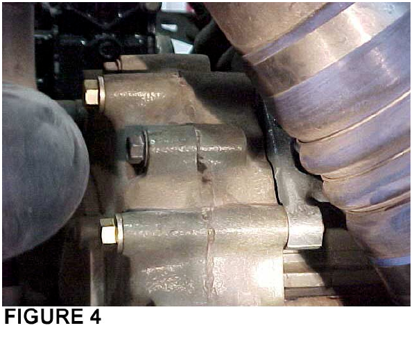 The procedure is the same as the above except there is no need for the breather tube clip and clip bracket attachments when installing the right side stabilizing bracket. Also, there is no crossover pipe and attachment bracket on the left side of the engine. Therefore, you simply use the two (2) new bolts, 23528812, supplied in the kit for attaching the bracket to the gear case/cover as show in figure 4.