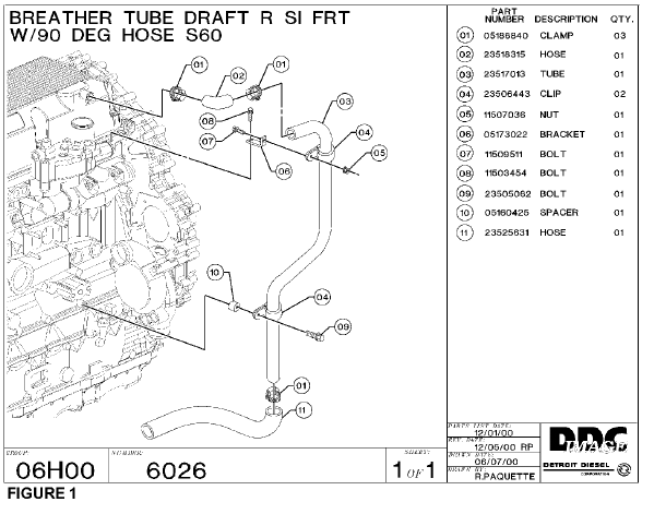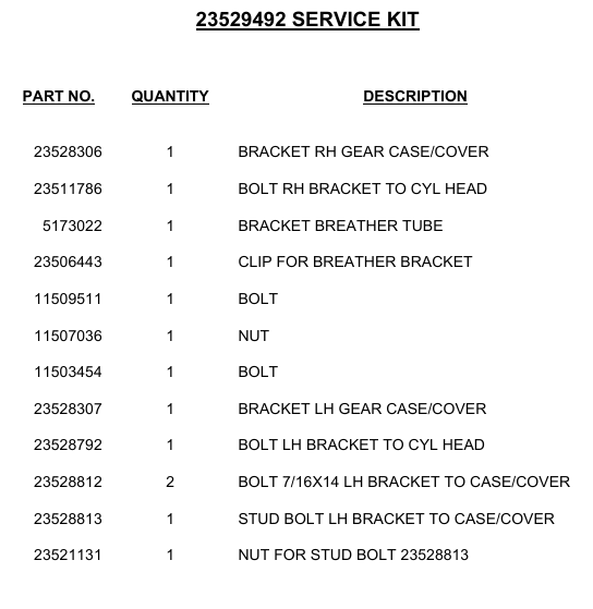 The hardware includes a new cast stabilizer bracket, 23528306, on the right side of the engine, replacing the former โLโ stabilizer bracket, 8929760, along with various attachment bolts, clips, and clip bracket to attach the breather tube (Items 04 โ 08 in figure 1). There is also a newly designed three-bolt bracket, 23528307, for the top left side of the engine, see figure 2. Both right and left side brackets, as well as attachment hardware, are included in kit number 23529492. A listing of kit contents is included with this service information letter (Attachment #1).