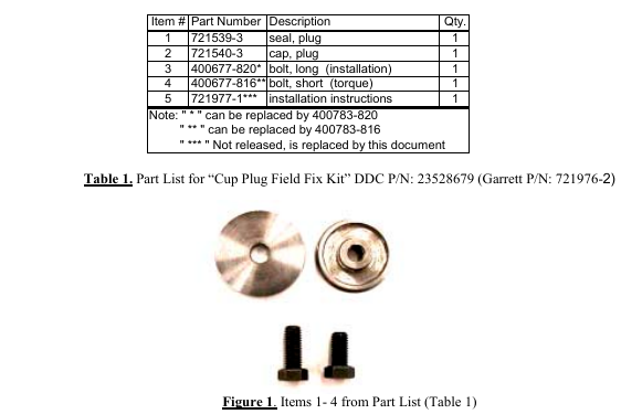 “Cup Plug Field Fix Kit” DDC P/N: 23528679 (Garrett P/N: 721976-2) is designed as a replacement part kit